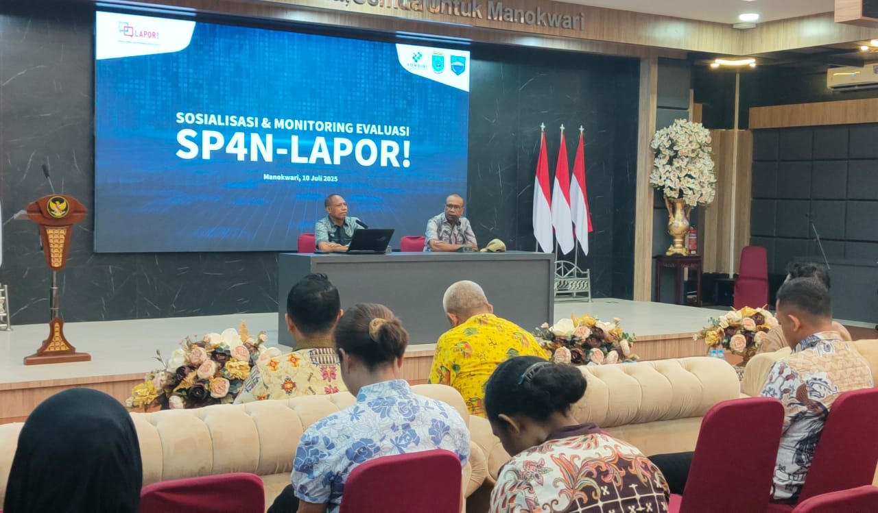 Pemerintah Provinsi Papua Barat melalui Dinas Komunikasi, Informatika, Persandian dan Statistik menggelar Sosialisasi Monitoring dan Evaluasi Sistem Pengelolaan Pengaduan Pelayanan Publik Nasional – Layanan Aspirasi dan Pengaduan Online Rakyat (SP4N Lapor) di Pemkab Manokwari, Kamis (10/7/2025).